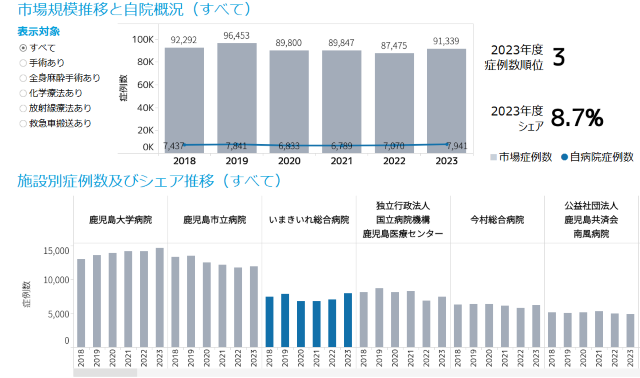 【図表1】大学病院、市立病院に次ぐ鹿児島で3番目の症例数となるいまきいれ総合病院(「病院ダッシュボードχ」の外部環境分析機能「マーケット分析」)