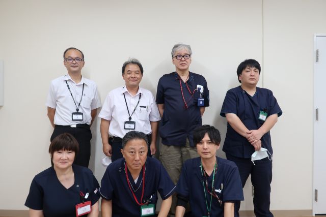 左上から時計回りに医事課の東貴史課長、濵田敏彦事務長、林茂昭副院長、視能矯正課の川畑真澄技師長、リハビリテーション課の前迫篤療法士長、地域医療支援センターの吉満実副室長、看護部の山下真理恵副看護部長