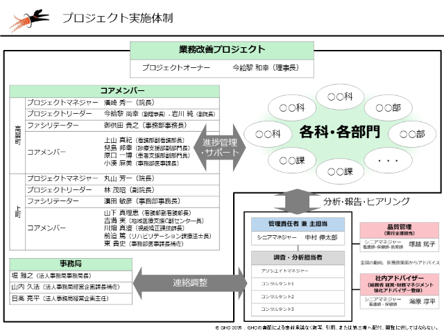 コンサルティング開始に伴い、今給黎理事長をトップに据えた「業務改善プロジェクト」の体制を構築(図表2)。昭和会の職員からなる事務局がGHCと各種調整をしつつ、いまきいれ総合病院および上町いまきいれ病院の各コアメンバーと連携しながら、各診療科・各部門の責任者とさまざまな課題について検討、改善推進していくプロジェクト実施体制となりました。