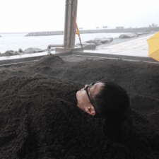 眼鏡をかけながら砂風呂に埋まり、汗をかく男性が、情報マネジメント部門に所属する「新海さん」こと、新海公彦です。